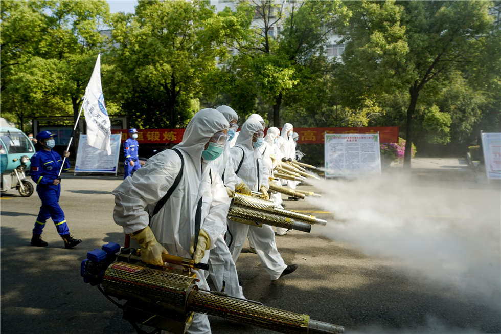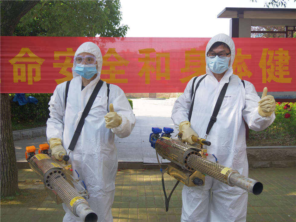 当天上午, 他们扛起专业的消杀设备,出动10台弥雾机,10台背负式喷雾器,身穿消毒防护服,戴着手套、防护口罩。伴随着阵阵“嗡嗡”的轰鸣声,一团团白色烟雾喷散而出,细密的消毒液喷雾均匀地喷洒在触目所及的地方。