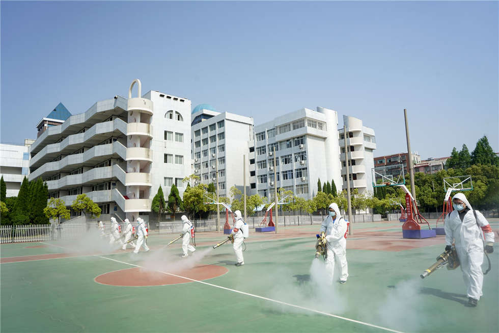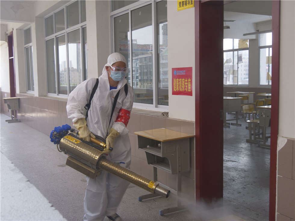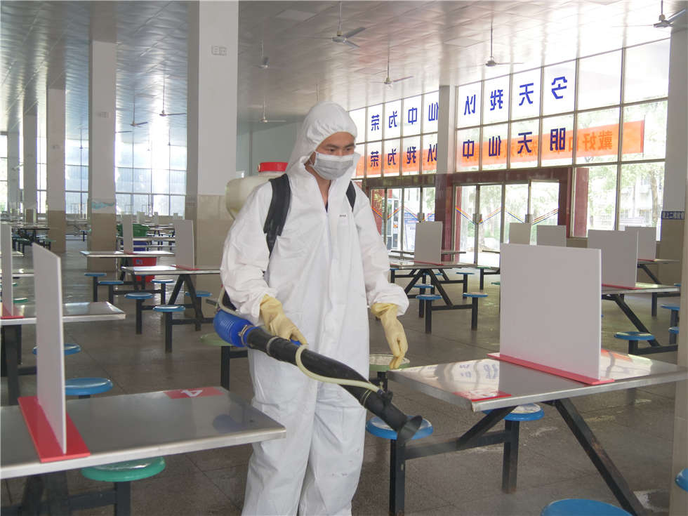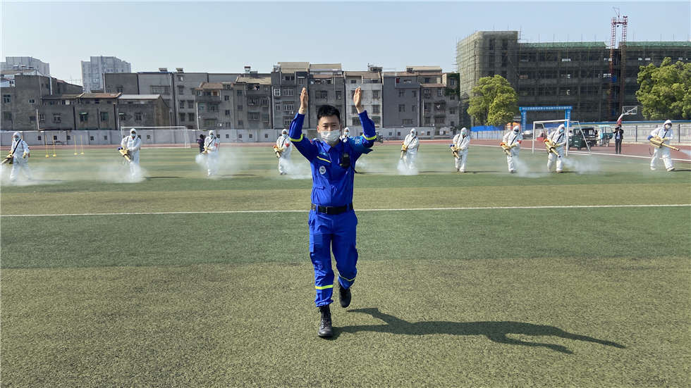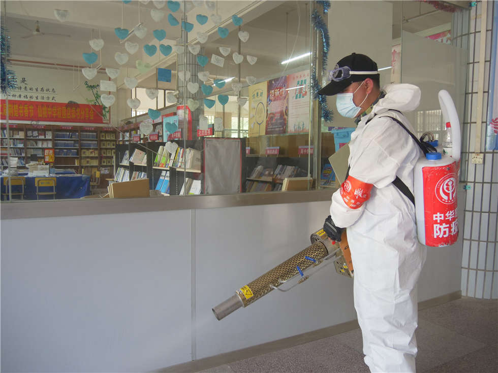队员们对学校操场、篮球场、校道、食堂、教学楼所有教室、教师办公室、卫生间、楼道、桌椅、窗台、门把手,都进行了全面喷洒,擦拭消毒,没有放过一个角落。
